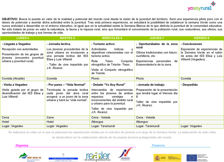 La actividad está incluida dentro del proyecto Yo soy Rural dirigido por la Red Asturiana de Desarrollo Rural (READER) y financiado por el Ministerio de Medio Ambiente, Medio Rural y Marino. La `Semana Verde´ busca la puesta en valor de la realidad y potencial del mundo rural desde la visión de la juventud afincada en el territorio.