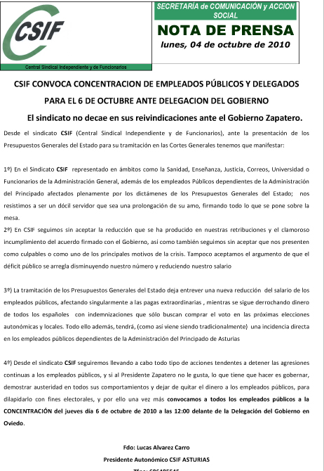 El sindicato CSIF convoca una concentración de empleados públicos y delegados para el 6 de octubre ante la delegación de gobierno de Asturias, en protesta por la reducción de sus retribuciones y el incumplimiento de los acuerdos.