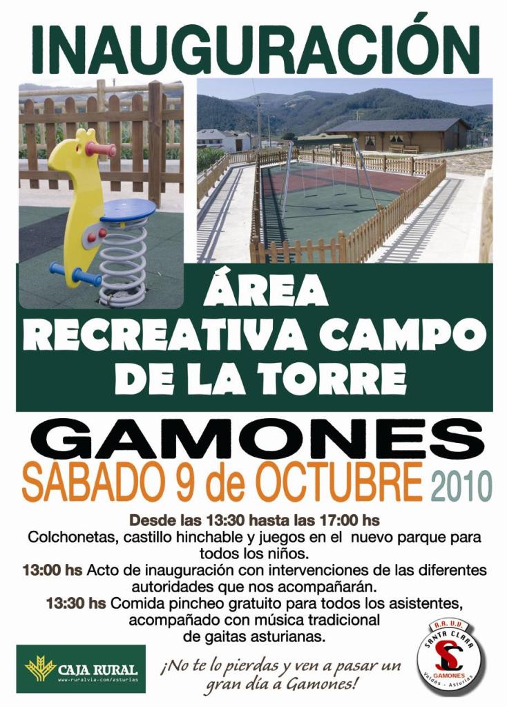 El próximo sábado 9 de octubre, se inaugurará en la parroquia de Gamones (municipio de Valdés, en el occidente asturiano) el Área Recreativa Campo de la Torre, una obra que ha sido financiada por la consejería de Medio Rural, con un coste que ronda los 120.000 euros, en los que se engloba un parque infantil, muros de cierre, accesos al local social, mesas y barandillas, además de unos baños para el local social que habían quedado pendientes cuando en 2009 se inauguró el mismo.