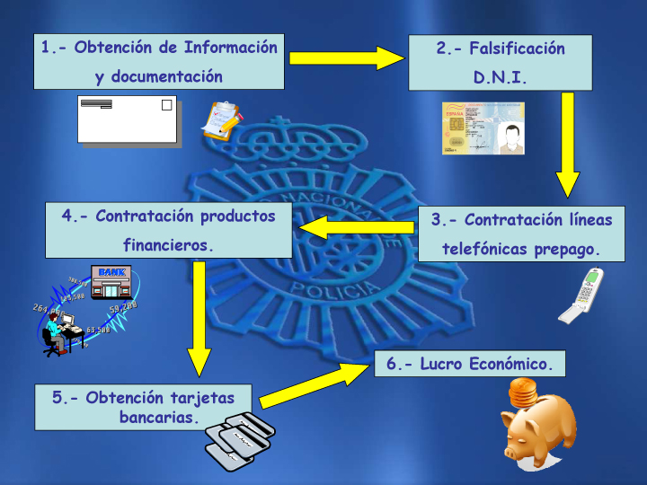A partir del nombre, apellidos y número de DNI de las víctimas, el estafador confeccionaba, a través de programas informáticos de edición de imagen, documentos falsificados, en los que el resto de los datos de identidad, tales como la fecha de nacimiento o el lugar de nacimiento, eran inventados.