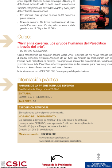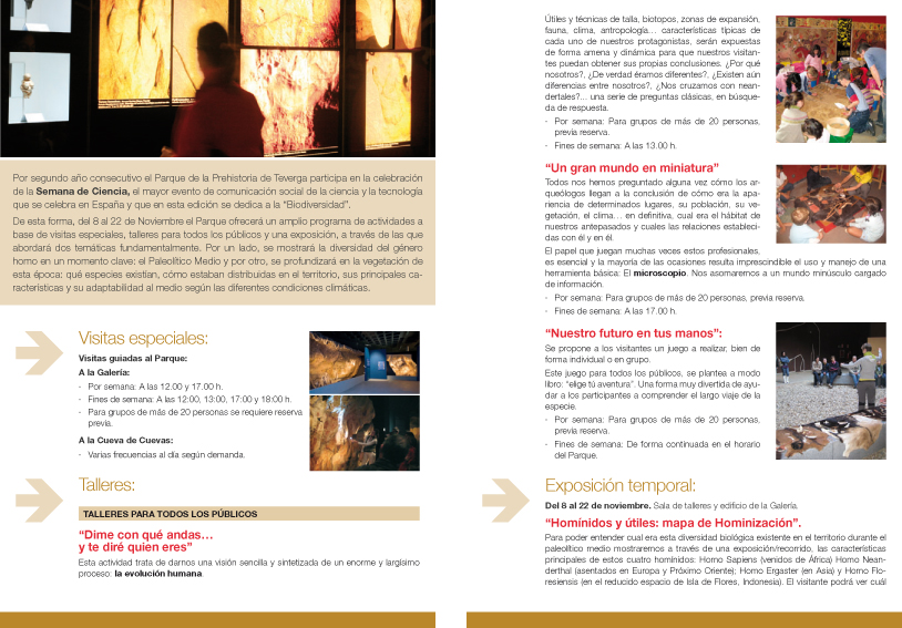 EL Parque de la Prehistoria de Teverga celebra por segundo año consecutivo la Semana de la Ciencia dedicada en esta edición a la Biodiversidad. Del 8 al 22 de noviembre se pone en marcha un amplio programa de actividades con visitas guiadas especiales a la Galería y la Cueva de Cuevas que podrán realizarse a las 12,00 y a las 17,00 en días laborales y a las 12,00, 13,00, 17,00 y 18,00 h durante el fin de semana.
