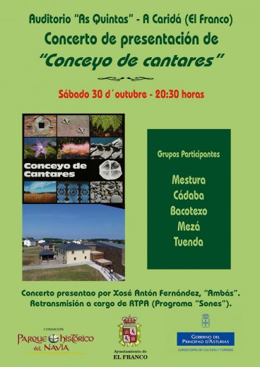 El sábado día 30 doutubre, nel auditorio municipal As Quintas, da Caridá, tivo llugar a presentación del CD Conceyo de Cantares, editao dende el Oficina de Coordinación Cultural y Llingüística del Parque Histórico del Navia coa collaboración y financiación da Conseyeiría de Cultura del Principao dAsturias y os Conceyos integraos nel proyecto da Fundación Parque Histórico del Navia.