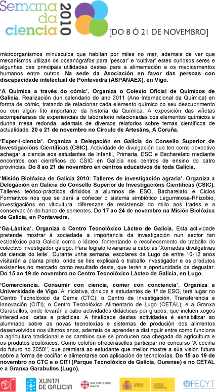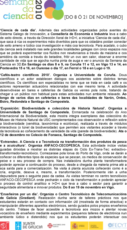 Por outra banda, durante a Semana da Ciencia as localidades de Narón, Ordes, Boiro, Redondela e Santiago de Compostela albergarán os “Cafés-teatro científicos 2010”, que consistirán en que dous científicos e un actor establecerán diálogos cos asistentes sobre distintos temas deste ámbito. A capital galega acollerá tamén a exposición “Biodiversidade e coleccións de Historia Natural” no colexio de Fonseca, así como a mostra “Mulleres Nobel en Física e Química. Unha visión non sexista da ciencia” e a iniciativa “O Camiño da Ciencia, o Camiño da Vida”, coa que se pretende dar a coñecer o proxecto Campus de Excelencia Internacional-Campus Vida.