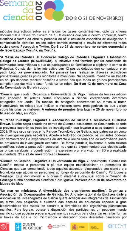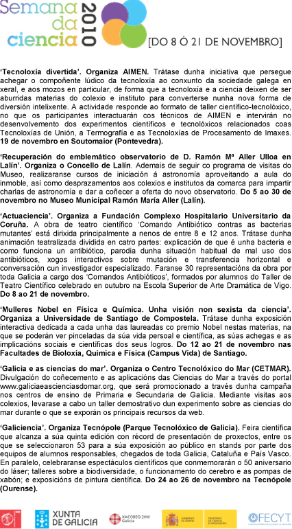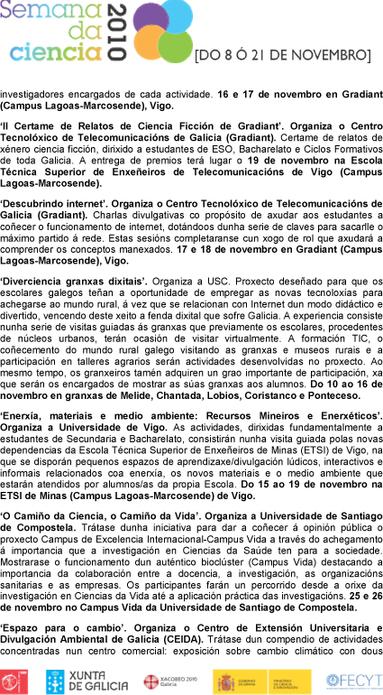 Na cidade de Pontevedra desenvolveranse os talleres “Tecnoloxía divertida” e “Misión Biolóxica de Galicia 2010”. En Lalín, pola súa banda, realizaranse cursos de iniciación á astronomía. A todo isto hai que sumar o proxecto “Diverciencia granxas dixitais”, para que os escolares de Melide, Chantada, Lobios, Coristanco e Ponteceso teñan a oportunidade de empregar as novas.