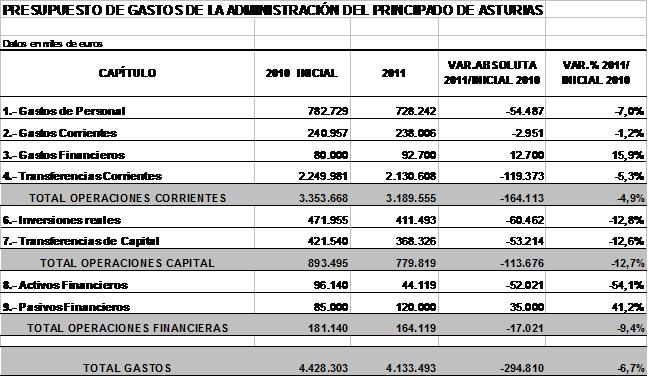 El Consejo de Gobierno del Principado de Asturias ha aprobado hoy el proyecto de Presupuestos Generales del Principado de Asturias de 2011, que asciende a 4.133,5 millones de euros, lo que supone un recorte del 3,29% respecto al presupuesto ajustado de 2010 y un 6,6% respecto al presupuesto inicial de este año.