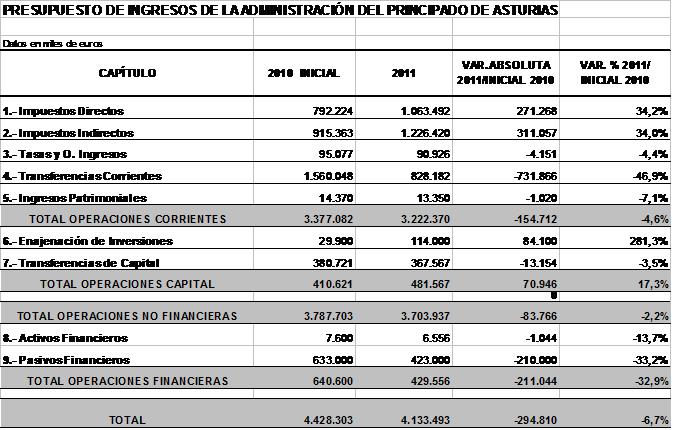 3 comentarios sobre “Los presupuestos asturianos para 2011 prevén ingresos gracias a más altos impuestos regionales, el canon de saneamiento, el nuevo tributo medioambiental a la energía eléctrica y las redes telefónicas, y la venta de parte del parque de viviendas sociales de la región