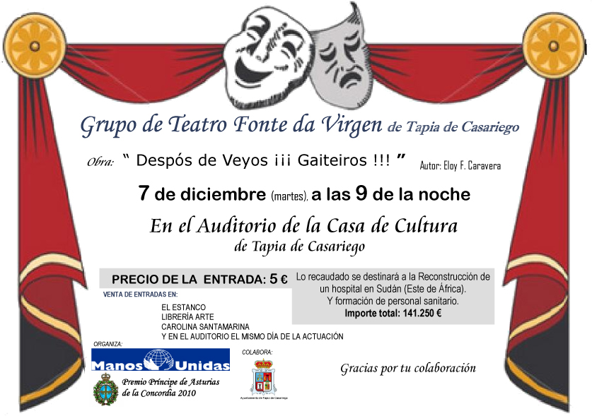 El próximo martes 7 de diciembre a las 9 de la noche, el Grupo de Teatro Fonte da Virgen de Tapia de Casariego representará la obra: «Despós de veyos ¡¡¡ Gaiteiros !!!».