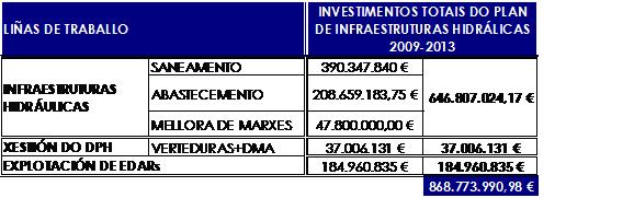Os investimentos dos que dispuxo a Xunta de Galicia ao longo destes 18 meses de traballo para a materialización das accións en materia hidráulica elévanse a 442.441.580, dos cales 107 millóns se destinaron a acadar os obxectivos en materia de infraestruturas e 241 para actuacións en materia de saneamento.