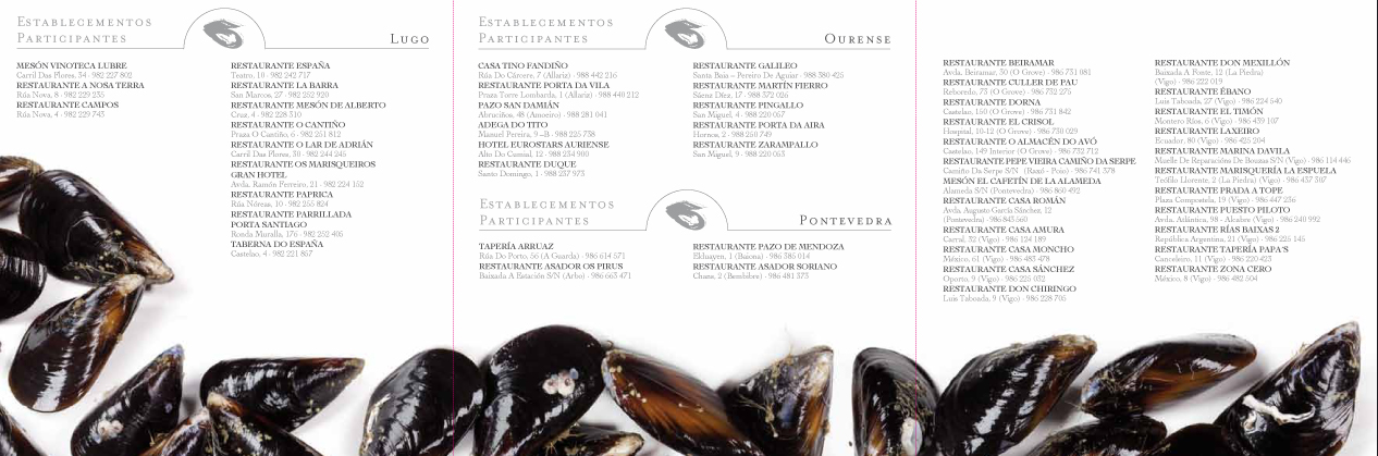 Os interesados en realizar a súa propia ruta de degustación do mexillón galego poden facelo a través dos trípticos informativos das xornadas que se distribúen nos restaurantes adscritos a esta iniciativa e nas oficinas de turismo. Entre os establecementos participantes, encóntrase o restaurante gañador do Concurso Profesional de Cociña mexillón de GALICIA celebrado en novembro.