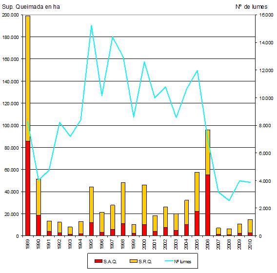 Como se aprecia na táboa, no 2010 baixa tanto o número de lumes como a superficie queimada en relación coas medias dos últimos dez e cinco anos.