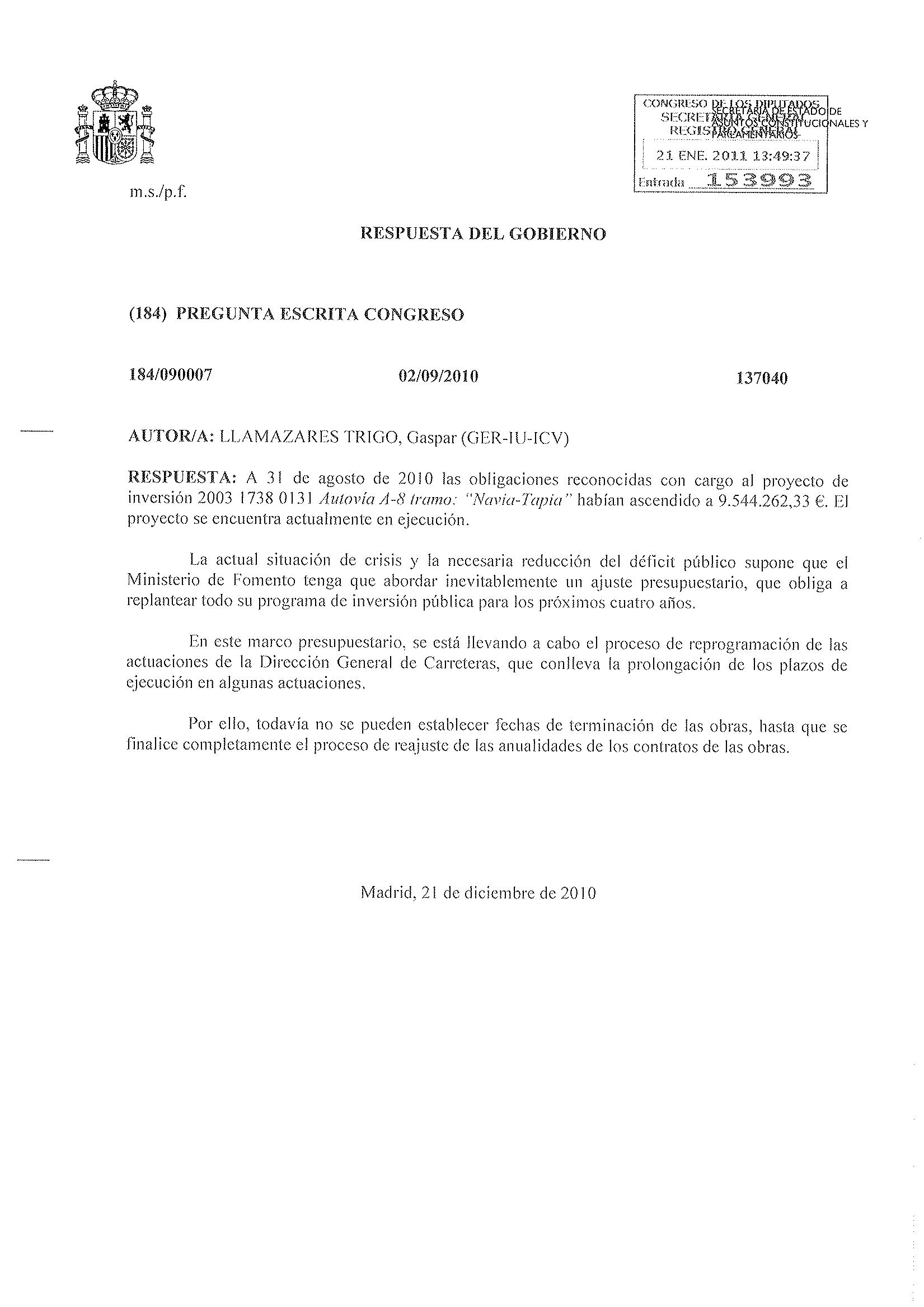 Izquierda Unida de Asturias ofrece las respuestas dadas por el Ministerio de Fomento a Gaspar Llamazares a preguntas escritas presentadas por el diputado de IU. Adjunto a continuación se presentan esas preguntas y respuestas sobre El Bao y sobre el tramo Navia-Tapia.