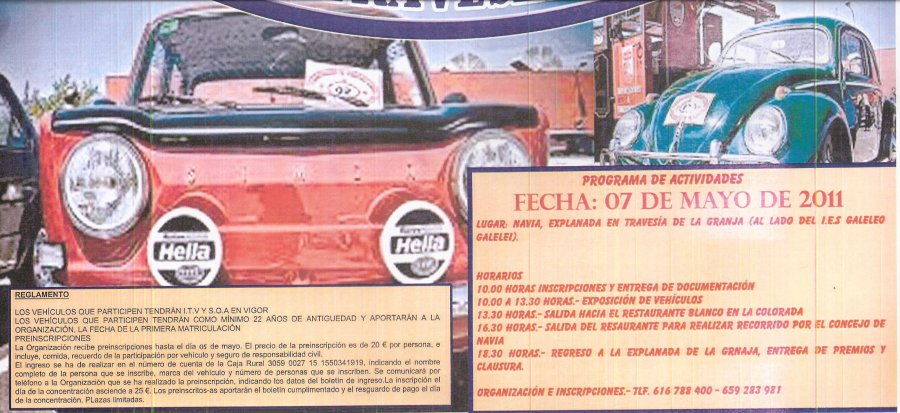 El próximo día 7 de mayo de 2011, a las 10 horas, EN LA EXPLANADA DE LA TRAVESÍA DE LA GRANJA, DE NAVIA, se celebrará la IV CONCENTRACIÓN DE VEHÍCULOS CLÁSICOS.