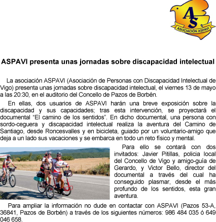 Aspavi presenta el viernes 13 de mayo unas jornadas sobre discapacidad intelectual en el concejo pontevedrés de Pazos de Borbén