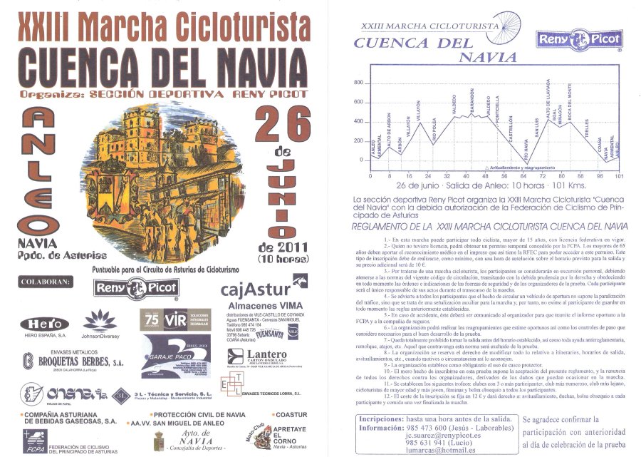 El próximo DOMINGO 26 de Junio a las 10:00 horas, se celebrará la XXIII MARCHA CICLOTURISTA DE LA CUENCA DEL NAVIA organizada por la Sección Deportiva de Reny Picot, colaborando en este evento, entre otros, el Ayuntamiento de Navia y la Federación de Ciclismo del Principado de Asturias.