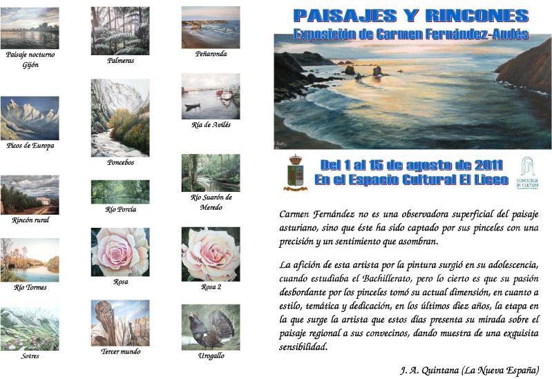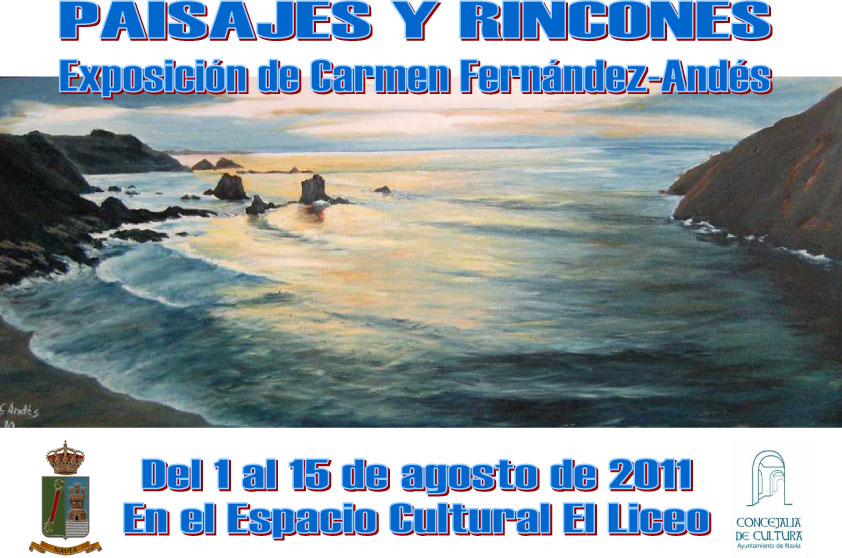 La exposición ‘Paisajes y Rincones’ tendrá lugar en el Espacio Cultural El Liceo de Navia a partir del día 1 de Agosto, donde se podrá apreciar la obra de Carmen Fernández-Andés. La obra «Paisajes y Rincones»se centra principalmente en la presentación de paisajes asturianos, captados por los pinceles de la autora con una precisión y sentimiento que asombra.