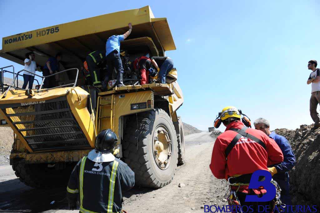 El Centro de Coordinación de Emergencias del 112-Asturias recibió el aviso a las 12:34 horas. En la llamada, transferida por el Servicio de Emergencias del 112 de Castilla y León, se indicó que un trabajador que estaba en la mina a cielo abierto de Cerredo había sido atropellado por un dúmper. De inmediato se movilizó al Grupo de Rescate de Bomberos de Asturias, a bordo del helicóptero medicalizado de la entidad, además de un helicóptero de Bomberos de Asturias de La Morgal , con un equipo de excarcelación, y con dos bomberos de este mismo parque. Una vez en el lugar, los efectivos comprobaron que no se trataba de un atropello, sino de una colisión por alcance entre dos dúmper. El conductor de uno de ellos quedó atrapado en el interior de la cabina de uno de los camiones. Una vez en el lugar, el Grupo de Rescate y los bomberos de La Morgal iniciaron la excarcelación del conductor, mientras era atendido tanto por el personal sanitario del SAMU desplazado al lugar, como por el médico de la empresa y el médico-rescatador del Grupo de Rescate. Una vez excarcelado se procedió a su traslado al HUCA.
