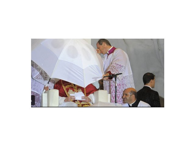 El papa, que preside la ceremonia religiosa y estaba interviniendo en el momento en que se ha interrumpido, fue protegido por un paraguas que sujetan dos ayudantes con dificultad a causa del fuerte viento.
