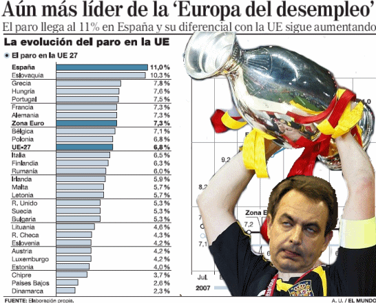 En julio de 2010, la tasa de paro fue del 9,7 % en los Veintisiete de la Unión Europea, del 10,2 % en la zona del euro como moneda única y del 20,3 % en España.