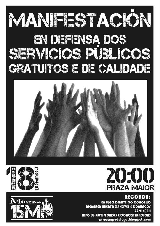 Ante os continuos ataques que están a sufrir os servizos públicos, principalmente sanidade e educación, o Movemento 15M Lugo chama á movilización o día 18 de setembro, sumándose ás convocatorias das diferentes cidades españolas.