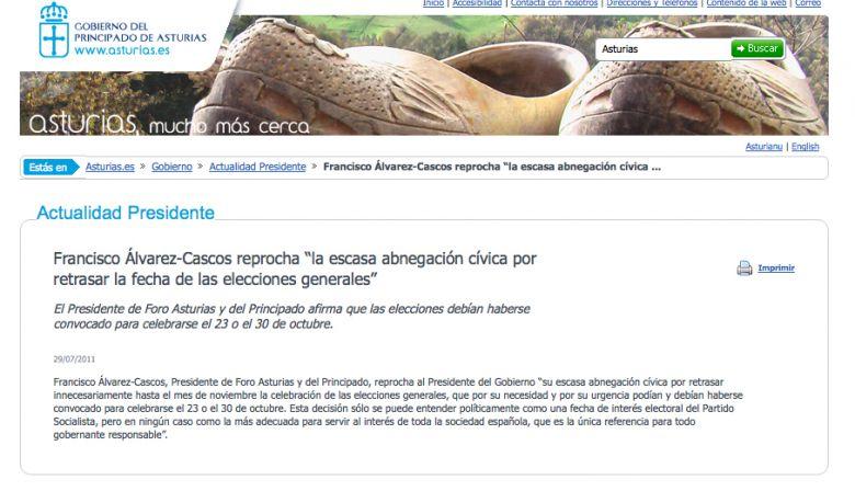 «Ya habían hecho algo parecido a finales de julio», -cuando en ese mismo portal se referían a Francisco Álvarez-Cascos como presidente de Foro Asturias en una nota sobre las Elecciones Generales-, «pero lo dejamos pasar porque creímos que se podía deber a la falta de experiencia de su gabinete», explicó Jesús Gutiérrez. «Pero lo que ha pasado en los últimos días demuestra que Francisco Álvarez-Cascos no sabe cuál es la frontera entre su partido y el Gobierno de todos los asturianos, lo cual es preocupante».