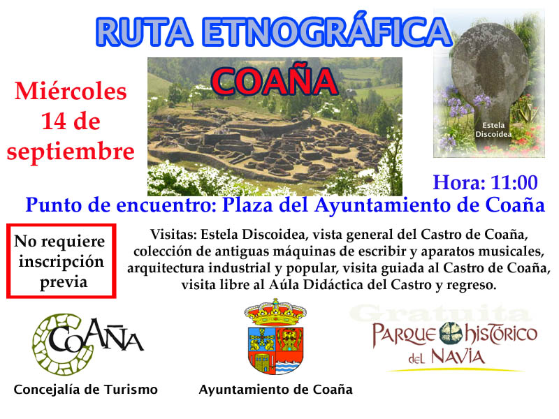 El próximo día 14 de septiembre tendrá lugar la RUTA ETNOGRÁFICA DEL CONCEJO DE COAÑA, será a las 11:00 h, teniendo como punto de encuentro la Plaza del Ayuntamiento de Coaña. Se visitará la Estela Discoidea, el Castro de Coaña, la colección de antiguas máquinas de escribir y aparatos musicales, visita libre al Aula didáctica del Castro y regreso. La ruta es gratuita y no precisa de inscripción previa.