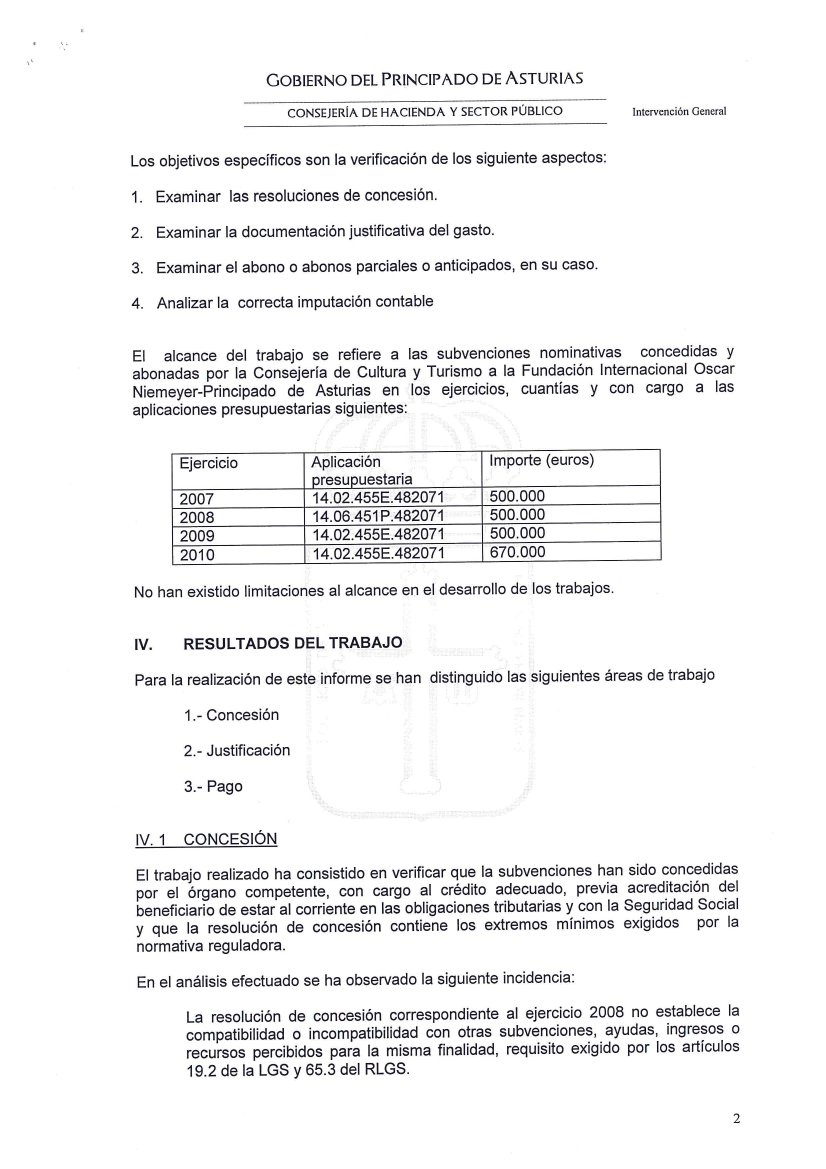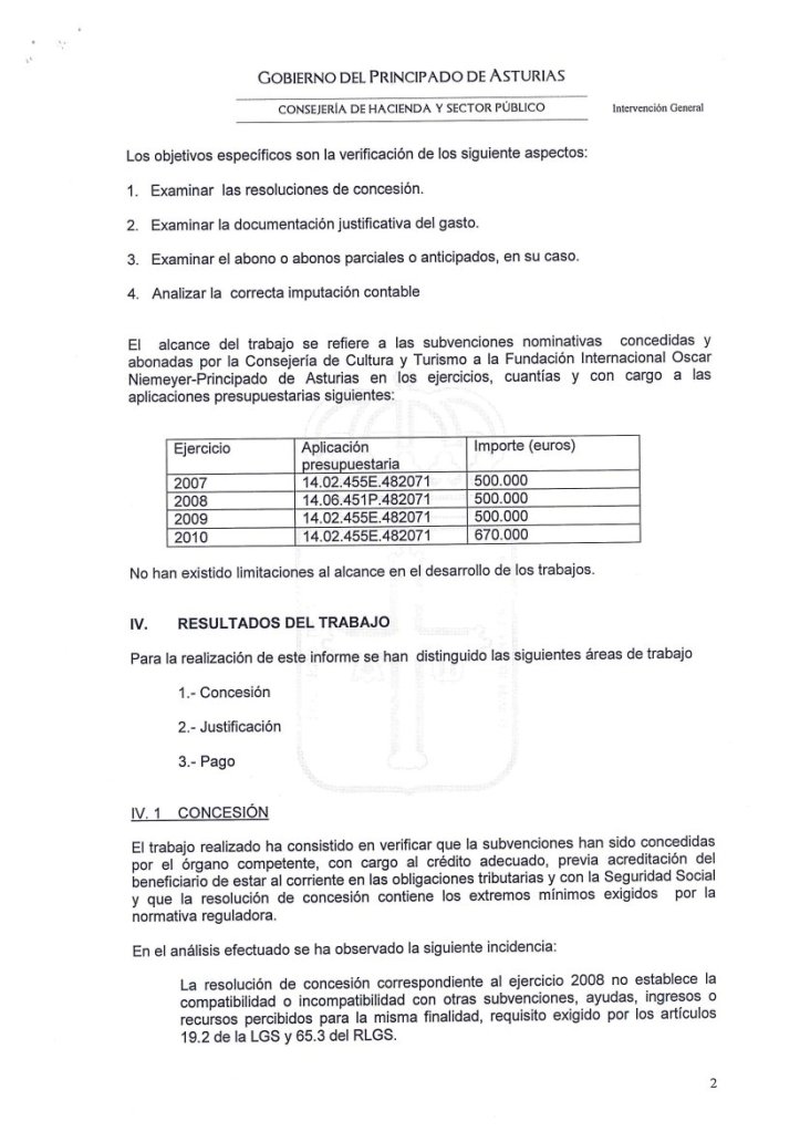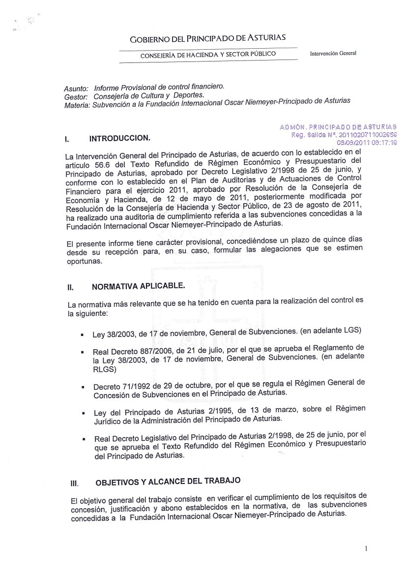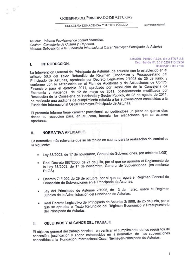 10-sept-2011 (Oviedo).-El informe íntegro de control financiero de la Intervención General del Principado, con fecha del 7 de Septiembre de 2011, sobre las subvenciones concedidas a la Fundación Niemeyer, refleja, entre otras, las siguientes irregularidades: