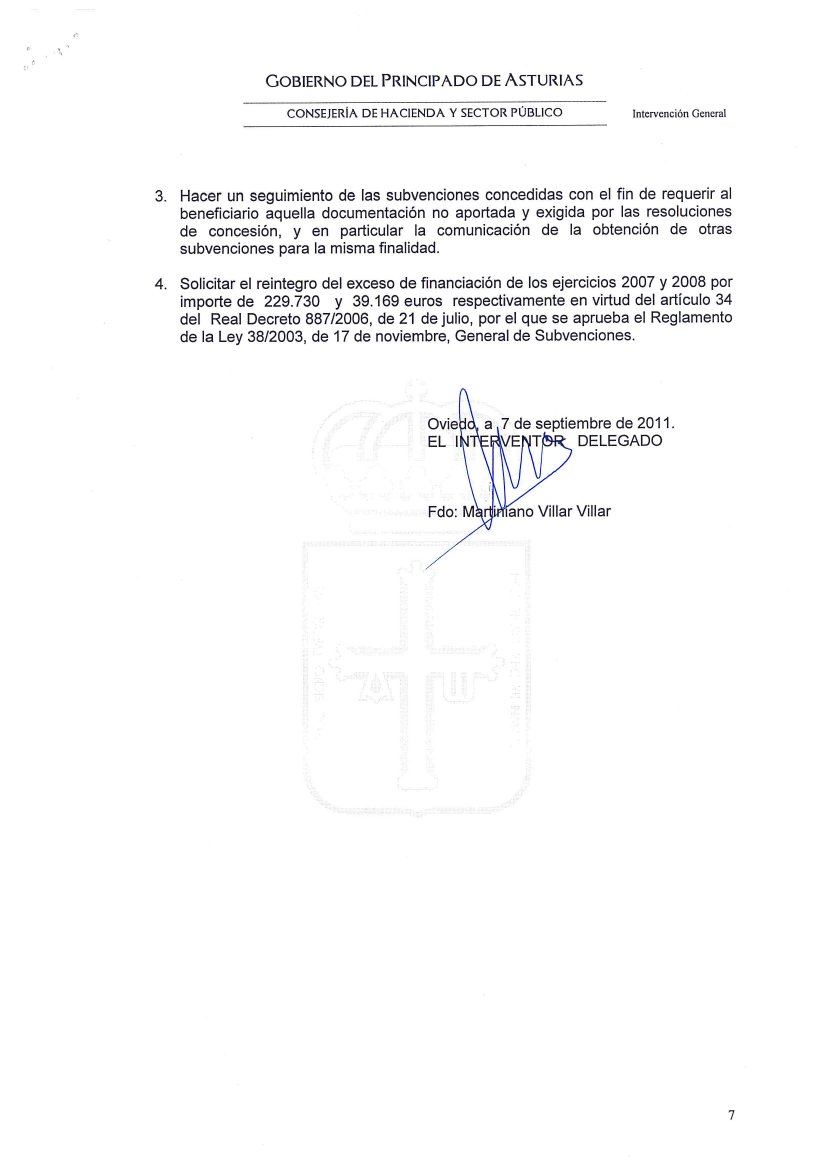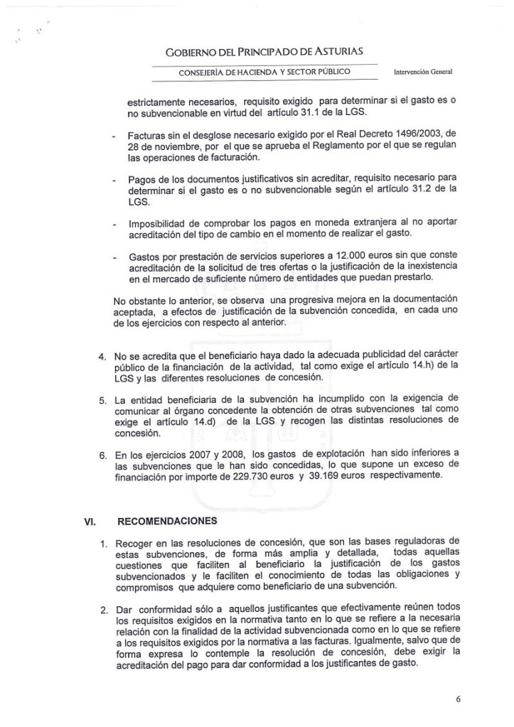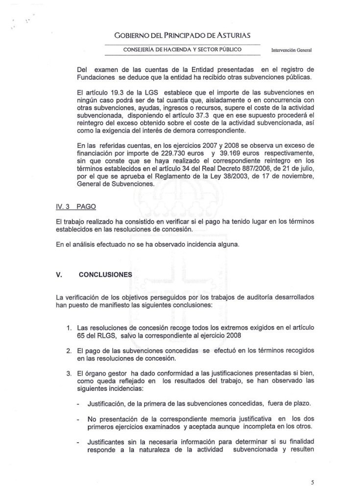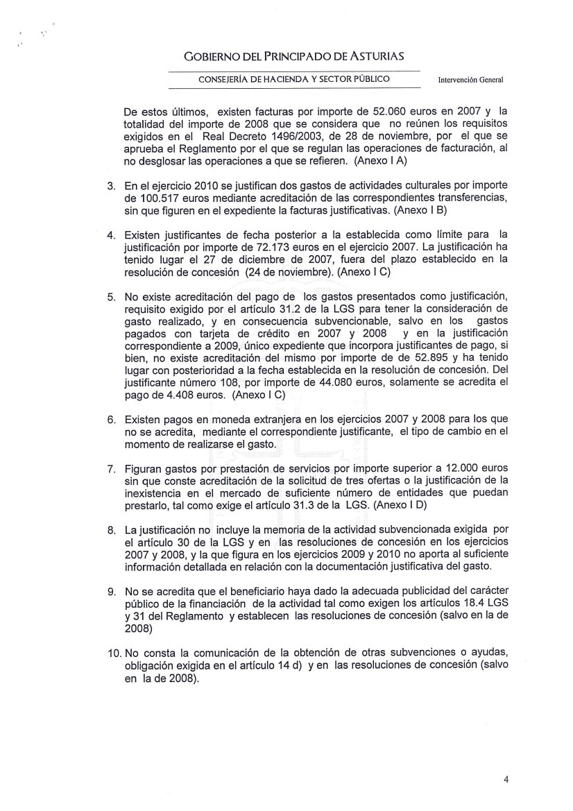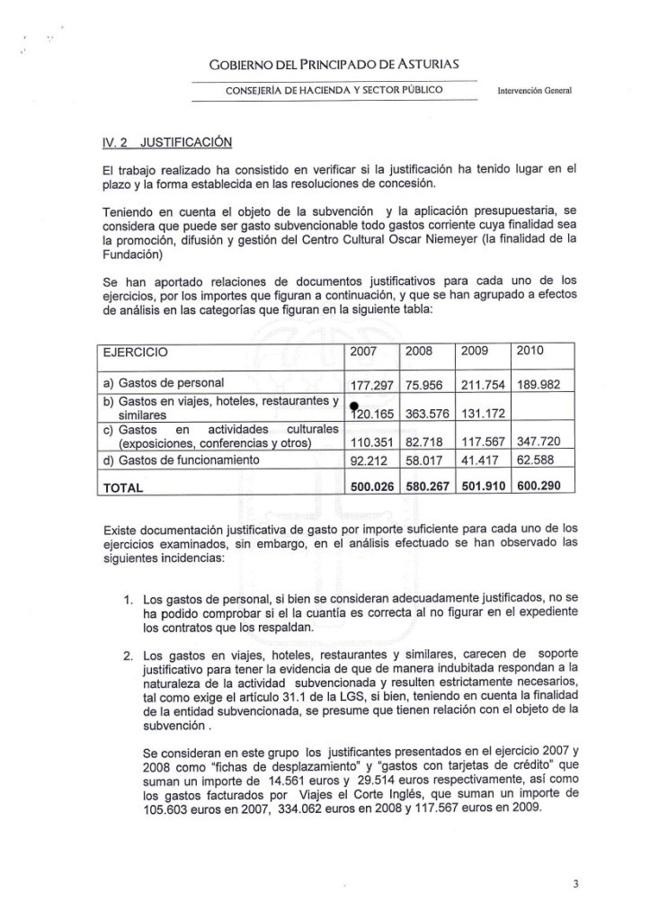 10-sept-2011 (Oviedo).-El informe íntegro de control financiero de la Intervención General del Principado, con fecha del 7 de Septiembre de 2011, sobre las subvenciones concedidas a la Fundación Niemeyer, refleja, entre otras, las siguientes irregularidades: