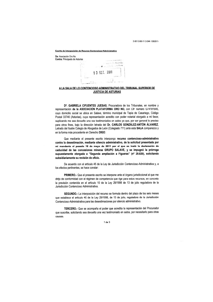 «Oro No» ha interpuesto un recurso contencioso-administrativo este lunes ante el Tribunal Superior de Justicia de Asturias contra la Consejería de Industria. El objetivo es que los jueces declaren que las concesiones mineras históricas con las que cuenta ASTURGOLD han caducado. Se trata del denominado «GRUPO SALAVE» compuesto por las concesiones «Dos Amigos» (nº 24.371), «Salave» (nº 25.380), «Figueras» (nº 29.500), «Ampliación a Figueras» (nº 29.969) y «Segunda ampliación a Figueras» (nº 29.820).