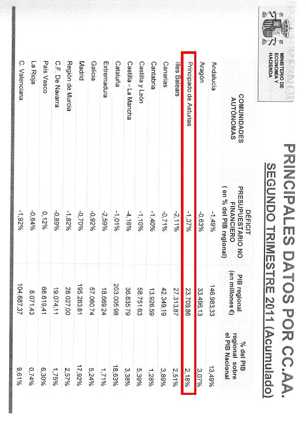 Es también el Ministerio de Economía el que, de acuerdo con sus propios cálculos, ha hecho público en documento oficial el alcance del déficit del Principado de Asturias. Son, pues, estos documentos oficiales los que dejan en evidencia la falta de correspondencia con la realidad de la versión que insisten en mantener los responsables del PSOE en Asturias.