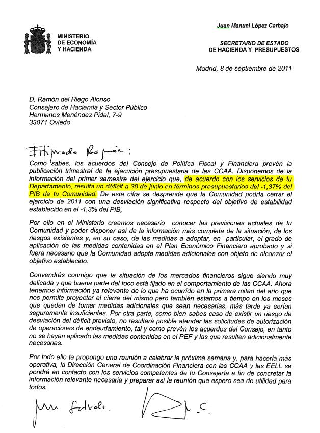 Documento 2 : Carta remitida por Juan Manuel López Carbajo, Secretario de Estado de Hacienda y Presupuestos, a Ramón del Riego, Consejero de Hacienda y Sector Público del Principado, el 8 de septiembre de 2011.