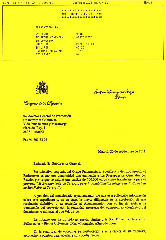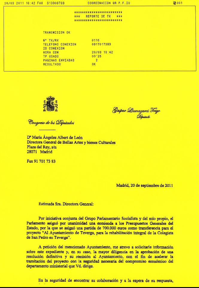 A continuación reproducimos las cartas enviadas por Gaspar Llamazares, diputado federal de IU, al Secretario General de Promoción de Industrias Culturales y a la Directora General de Bellas Artes y Bienes Culturales, interesándose sobre por qué no se ha producido la transferencia de la partida dedicada a la restauración de la Colegiata de Teverga contemplada en los presupuestos generales del Estado.