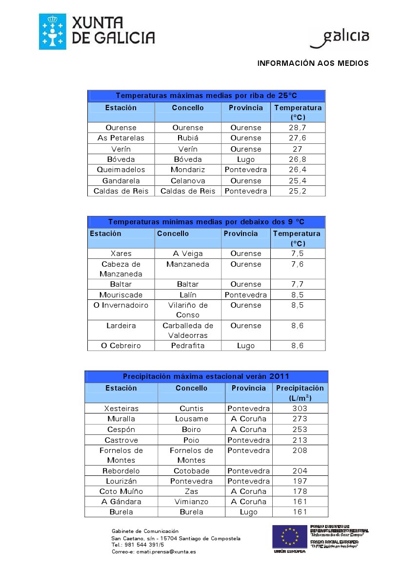 En las siguientes tablas se muestran las temperaturas máximas y mínimas registradas en las estaciones de Meteogalicia en este verán.