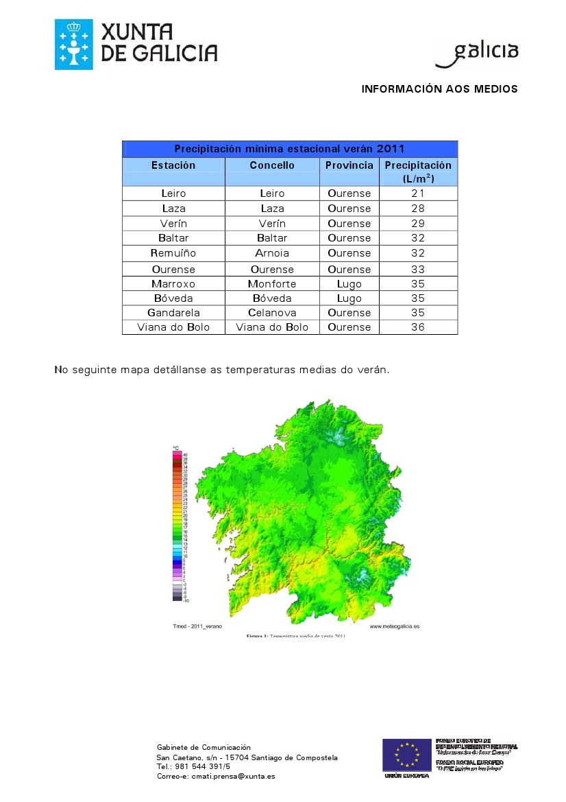 Como se puede apreciar, las temperaturas más cálidas se dieron en el tercio sur de la comunidad, si bien las temperaturas medias fueron suaves. En general, habida cuenta las temperaturas mínimas, el verano se puede calificar cómo frío, siendo normal o cálido por el contrario, en zonas de las comarcas de la Baixa Limia y Verín.