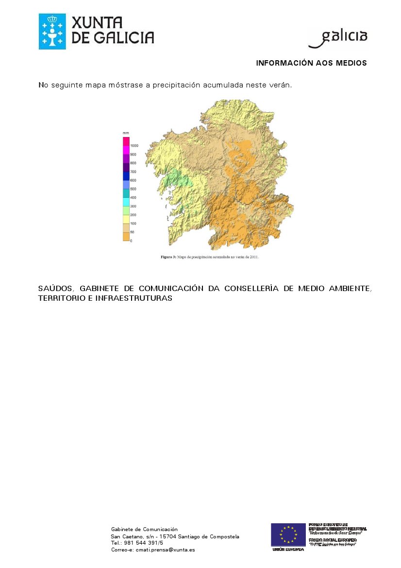 Santiago, 1 de octubre de 2011.-La Consellería de Medio Ambiente, Territorio e Infraestructuras presenta un informe climatológico de este veraro, marcado por las temperaturas suaves y las precipitaciones escasas. Este documento puede consultarse a través del siguiente link: http://www.meteogalicia.es/datosred/infoweb/clima/informes/estacions/estacionais/2011/veran_2011_gl.pdf.