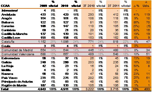 Por sectores, los de construcción e inmobiliario continúan aglutinando el mayor número de insolvencias con el 45% del total (26% y 18% respectivamente). El crecimiento de los concursos en estos dos sectores crece un 12% y un 23% en comparación con los nueve primeros meses de 2010, lo que implica, en términos absolutos, un incremento de 104 y 125 concursos, respectivamente. El aumento, sostenido en los últimos trimestres en estos sectores, se explica porque la mayoría de las refinanciaciones de las empresas del sector se realizaron a lo largo de 2008 por periodos de dos a tres años. Estas refinanciaciones no han conseguido en casi ningún caso resolver la situación de las compañías, lo que ha abocado a situaciones de concurso.