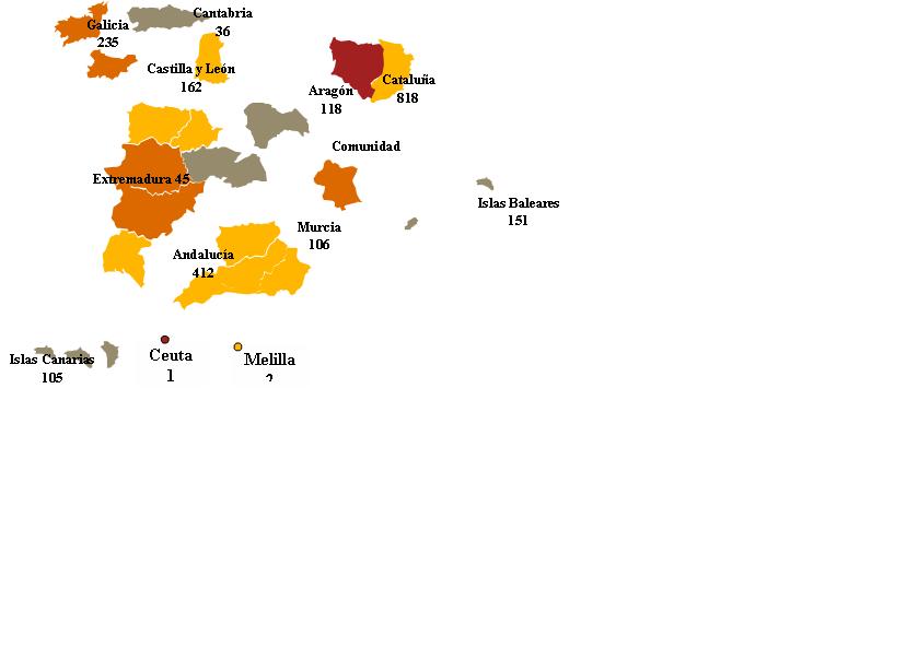 Por Comunidades Autónomas, Cataluña -22%-, la Comunidad Valenciana -15%- y la Comunidad de Madrid -13%- concentran la mitad del total de concursos publicados en toda España. Le sigue Andalucía que representa el 11% de los concursos, y en quinta y sexta posición País Vasco (7%) y Galicia (6%). Entre enero y septiembre, las comunidades que más ha crecido su actividad concursal son Baleares (pasando de 81 a 151 concursos), Cantabria (de 20 a 36) y Extremadura (de 26 a 45), experimentando, por lo tanto, crecimientos del 86%, 80% y 73%, respectivamente.