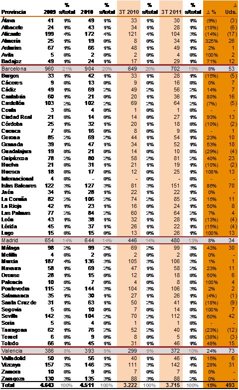 En el conjunto de España, el número de concursos mercantiles ascendió a 3.715 entre enero y septiembre, lo que supone un incremento del 15% en comparación con el año anterior. Si miramos la actividad sólo en el tercer trimestre de 2011, las insolvencias alcanzaron la cifra de 995, un 21% más que entre julio y septiembre de 2010. Estas son algunas de las conclusiones que se desprenden del Baremo Concursal que trimestralmente elabora PwC, a partir de la información publicada en el Boletín Oficial del Estado.