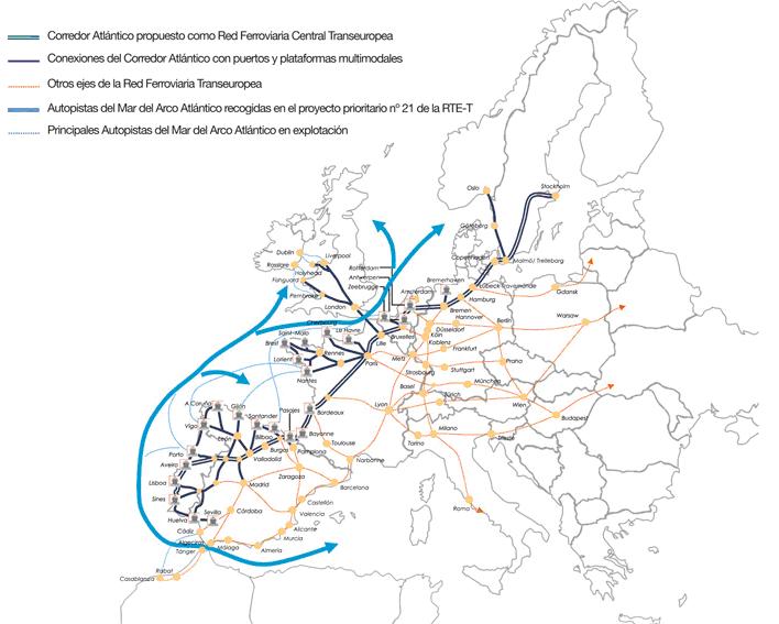 El denominado Corredor Atlántico conecta diferentes regiones de los países de Portugal, España, Francia, Irlanda, Reino Unido, Bélgica, Holanda, Alemania, Dinamarca, Suecia, Noruega, prolongándose hacia el sur a través del Puerto de Algeciras y Marruecos y hacia el norte y el Este de Europa, a través de diversos puertos y ejes europeos.