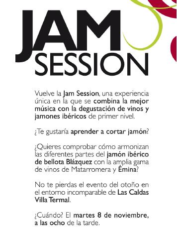 Una Jam Session es una experiencia única, en la que se entremezclan música y jamón, aderezados además en este caso con vino.La Jam Sessionpretende crear cultura sobre el mundo del jamón, explicar a los asistentes las diferentes partes de la pieza, como cortarla, como conservarla y como consumirla.