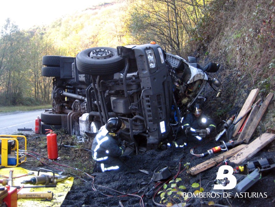 El Centro de Coordinación de Emergencias del 112-Asturias recibió el aviso a las 09.35 horas. En la llamada señalaban que un camión que transportaba carbón había volcado en la citada carretera. Creían que el conductor estaba atrapado en el interior de la cabina.