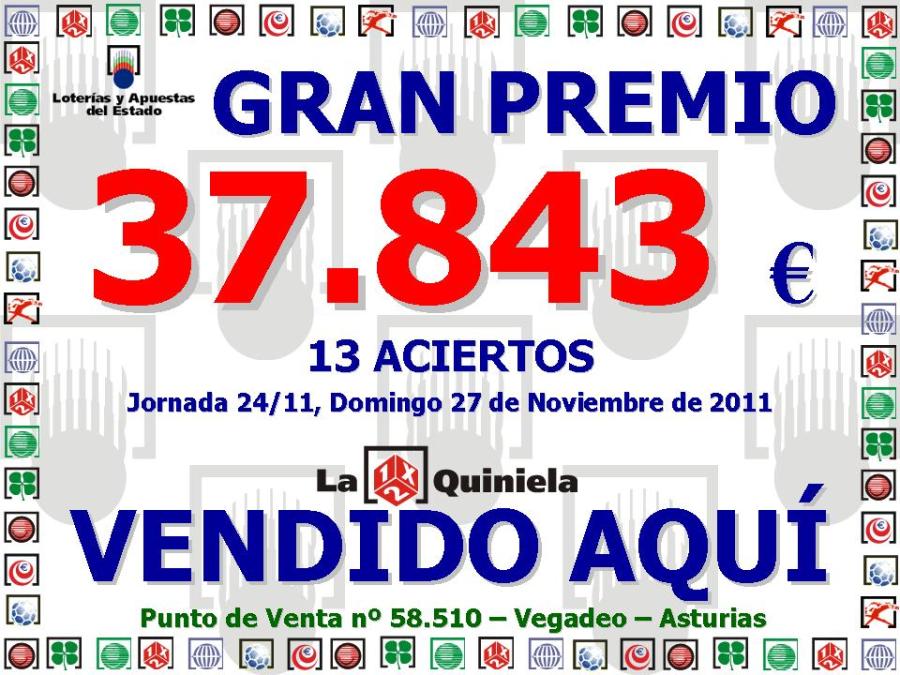 En la quiniela de la jornada 24/11 del domingo 27 de noviembre en la administración de loterías Casa Salas de Vegadeo, ha sido validado un boleto con un premio de 3ª categoría (13 aciertos ), que ha sido agraciado con un premio de 37.843 euros.