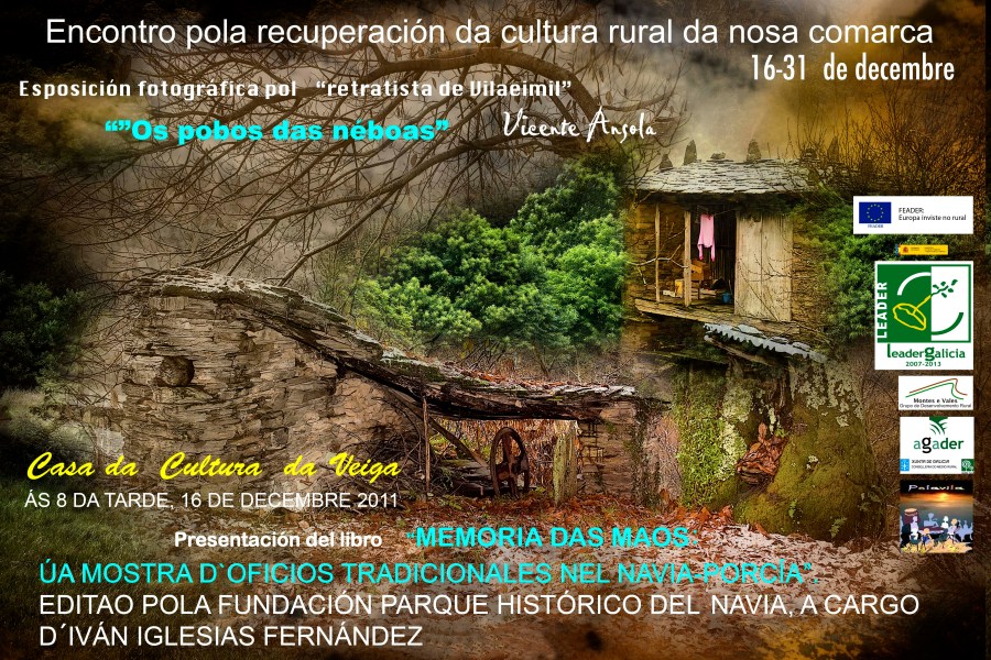 El acto, que nun quer outra cousa que valir pr’axudar á recuperación y dignificación da nosa cultura rural, ha consistir na inauguración da esposición fotográfica «Os pobos das néboas» de Vicente Ansola, unde se retratan os sitos y as xentes de Vilaeimil (A Pontenova- Lugo), pol autor, y na presentación del libro «Memoria das maos: úa mostra d’oficios tradicionales nel Navia-Porcía«, editao pola Fundación Parque Histórico del Navia, a cargo d’Iván Iglesias Fernández. Á esposición, y a obra d’Ansola en xeneral, que pretende fomentar a fotografía como unha forma de conservar y respetar el patrimonio en cuanto á arquitectura popular y el estilo de vida rural, quedará aberta na Sala d’Esposicióis da mesma Casa da Cultura hasta el día 31 d’este mes. A entrada é libre y gratuita.