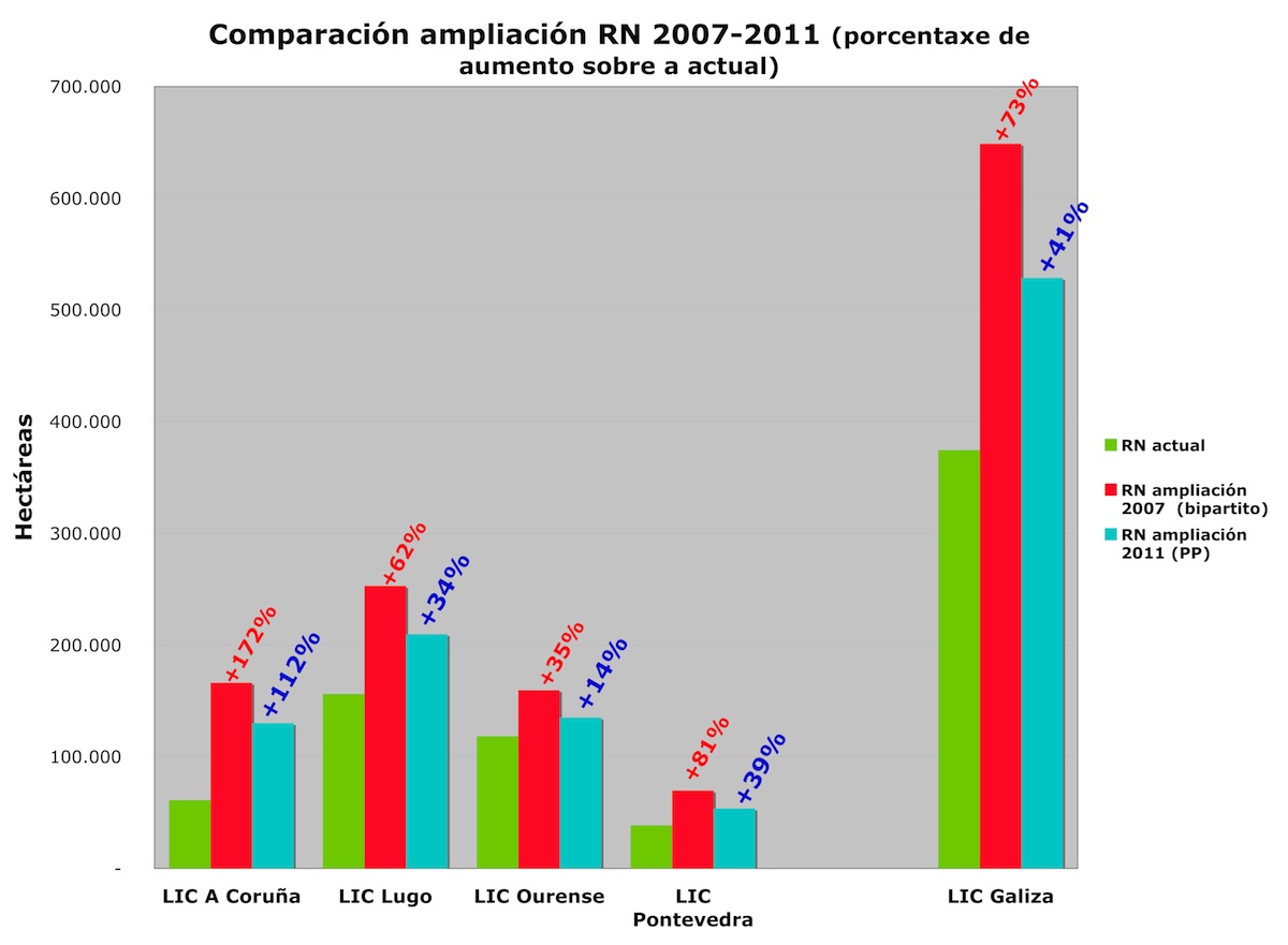 elaborara o bipartito en 2007 (1.57 Mb), que pretendía chegar até o 18% do territorio baixo esta figura de protección. Así as cousas, e despois que nestes 2 anos a Xunta perpetrara unha política de sistemática demolición da protección da natureza (modificacións lei do solo, eliminación de trámites ambientais, POL e Plano Director da RN hiperpermisivos) rematando coa Lei de Industria por se quedaba algún territorio que non se puidera asaltar, a Rede Natura deixou de ter sentido como rede ecolóxica e pasou a ser chan barato para a especulación.