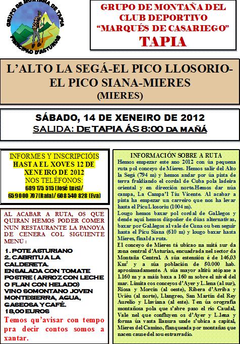 Despós de recibir os regalos de Reis, el Grupo de Montaña de Tapia empezamos coas nosas rutas y actividades de montaña. Estrenámosnos por Mieres. Hemos fer a travesía titulada: L’ALTO LA SEGÁ-EL PICU LLOSORIO- EL PICU SIANA-MIERES.
