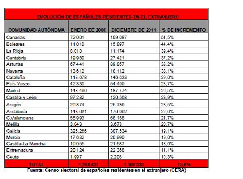 En enero de 2008, año que se considera como el inicio de la crisis económica, residían fuera de España un total de 1.201.433 españoles mayores de 18 años, según datos del Censo Electoral de Españoles Residentes en el Extranjero (CERA). Más de cuatro años después, periodo que está abarcando la crisis económica y laboral que afecta a Europa, esta cifra se elevó hasta 1.509.333, lo que supone un incremento del 25,6% o, lo que es lo mismo, 307.900 españoles mayores de edad dejaron nuestro país para residir fuera de nuestras fronteras, por lo que podría afirmarse que han emigrado fuera de España para trabajar o acompañando a un familiar que ha cruzado la frontera por razones laborales.