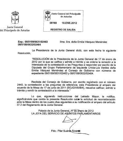 Nota de prensa de Emilia Vázquez, diputada de IU-Verdes en la Junta General, sobre la respuesta que ofrece el Gobierno de Álvarez Cascos a por qué publicaron todos los datos personales de los alegantes a la mina de oro de Salave.