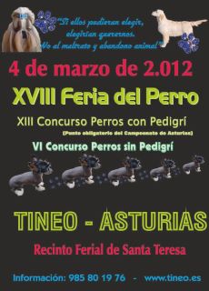 El próximo día 4 de marzo de 2.012 se celebran, en el Recinto Ferial de Santa Teresa de Tineo, la XVIII Feria de los Perros, el XIII Concurso Canino para perros con pedigrí y el VI Concurso Canino para perros sin raza.