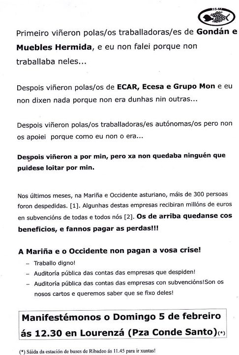 Na Mariña e no Occidente queremos berrar que estamos fartas, que esta crise non a pagamos (máis). E convocamos a todas as persoas a facelo xuntas. Os partidos políticos e sindicatos foron invitados explícitamente a participar nesta manifestación. Igualmente, invitamos desde aquí ás asociacións e colectivos, ás veciñas e aos veciños. O domingo día 5 de febreiro, ás 12 da mañá, na Praza do Conde Santo de Lourenzá.