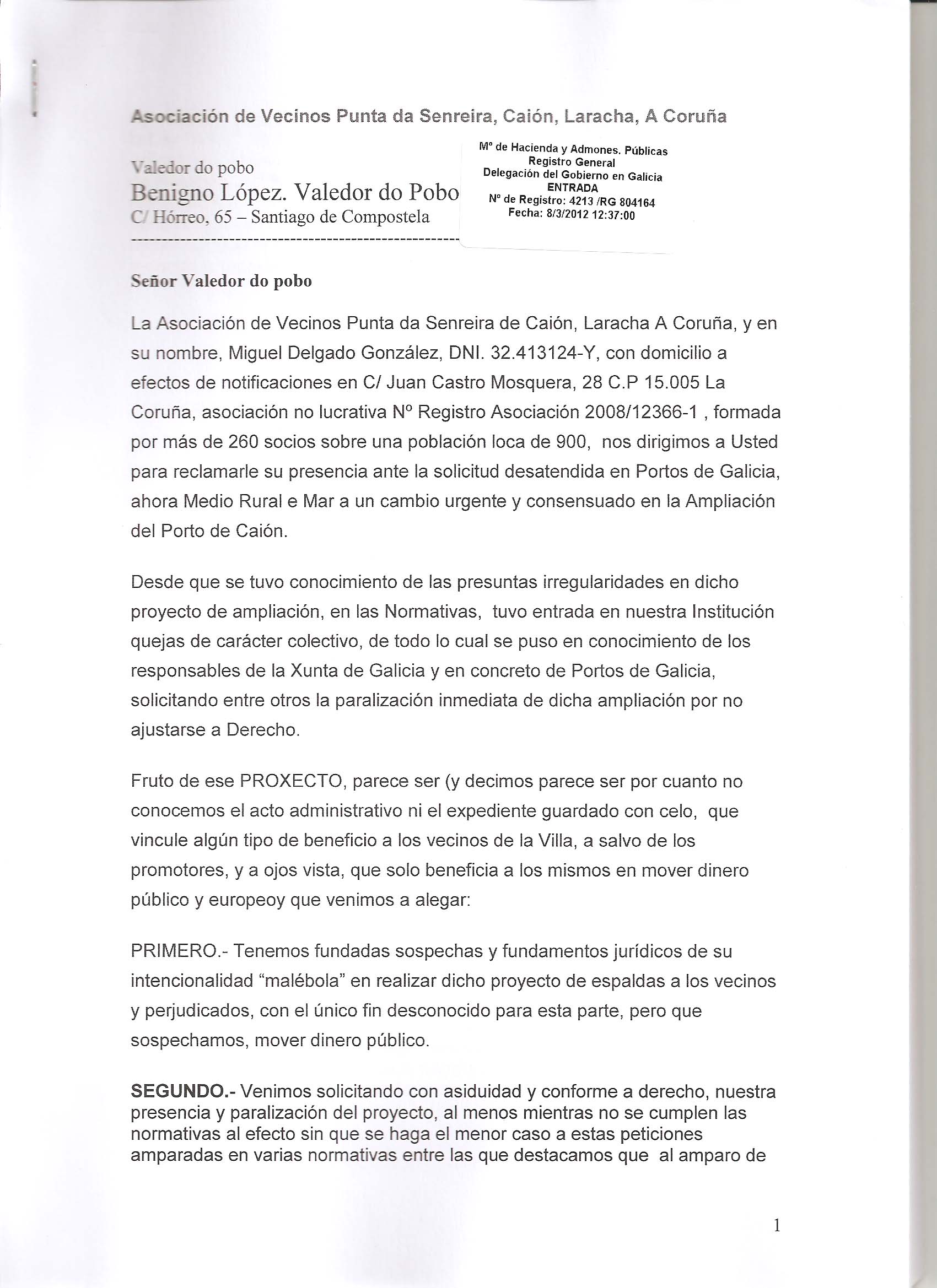 Dice la carta al Defensor do Pobo: Fruto de ese PROXECTO DE AMPLIACIÖN, parece ser (y decimos parece ser por cuanto no conocemos el acto administrativo ni el expediente guardado con celo,  que vincule algún tipo de beneficio a los vecinos de la Villa, a salvo de los promotores, y a ojos vista, que solo beneficia a los mismos en mover dinero público y europeo, han presentados los trámites administrativos a los que la Xunta de Galicia, Portos de Galicia, hace caso omiso incumpliendo la Ley del procedimiento administrativo,  de forma “burda “ y atentando contra estos principios básicos de todos los ciudadanos/as