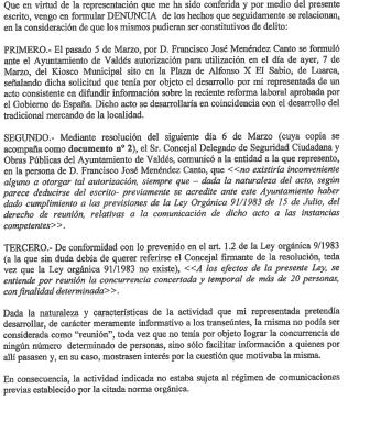 Denuncia efectuada por el servicio jurídico de IU de Asturias por la negativa del concejal de Obras de Valdés de permitir que IU expusiera su opinión contra la reforma laboral en la Plaza del ayuntamiento